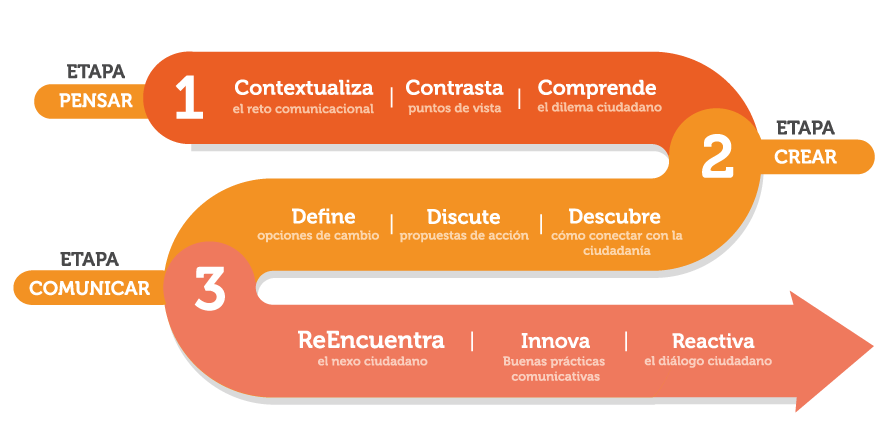 Conforma nuestra ruta de aproximación a todo reto comunicacional. Prioriza el descubrimiento y discusión de dilemas ciudadanos, las innovaciones y buenas prácticas comunicativas para instituciones dialogantes.
